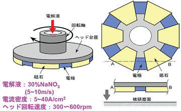 この技術を使うと、素材表面の欠陥除去効果が高く、粗目やピットがほぼ消えるという。電解砥粒ヘッドを回転させながら高速で中性電解液を送り通電。短時間で効率的に1パスで30ミクロンも削れるという(通常研磨は数ミクロンにとどまる)。