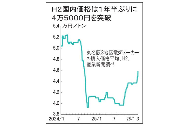 鉄スクラップ相場1000円続伸 H2、1年半ぶり4.5万円超