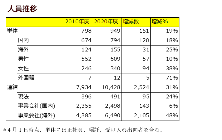「単体は949人で10年前に比べて約20%増加。連結は1万428人で約30%増加している。単体では海外ビジネスの拡大によって海外駐在員が増えている。2009年から一般職採用を開始したこと、総合職でも一定数を安定的に採用出来ていることから女性社員の増加率も高い。連結では海外ビジネスの拡大によって現法・事業会社の伸びが著しい」