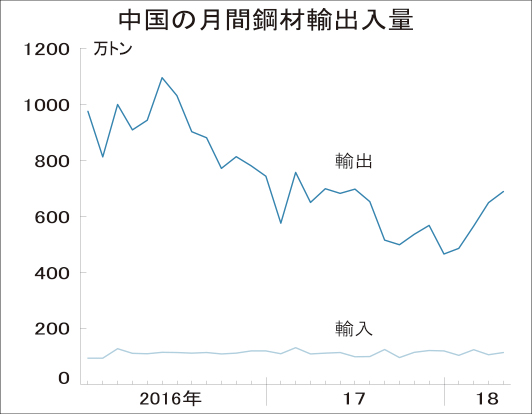 18年06月11日5月中国鋼材輸出、4カ月連続増688万トン 前年比では減少続く
