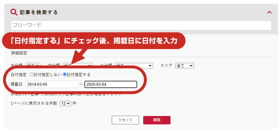 - 「日付指定」の「日付指定する」にチェックし、「掲載日」で検索したい期間を選択
