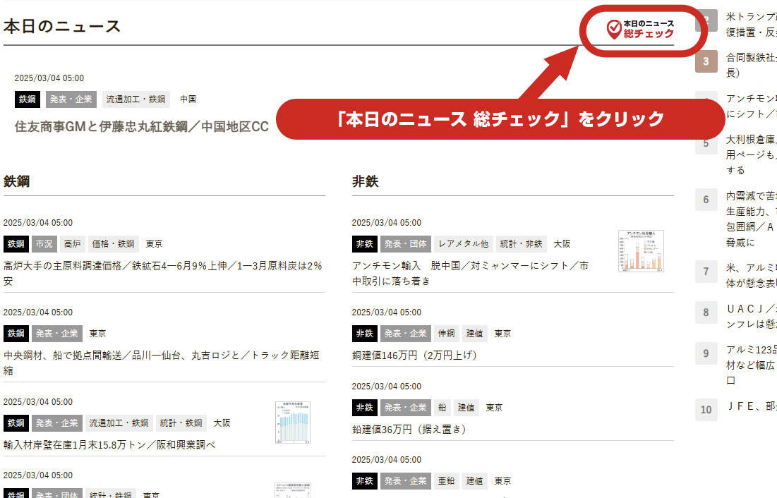 - 「今日のニュース 総チェック」をクリックまたは「日付で探す」のカレンダーより今日の日付をクリック