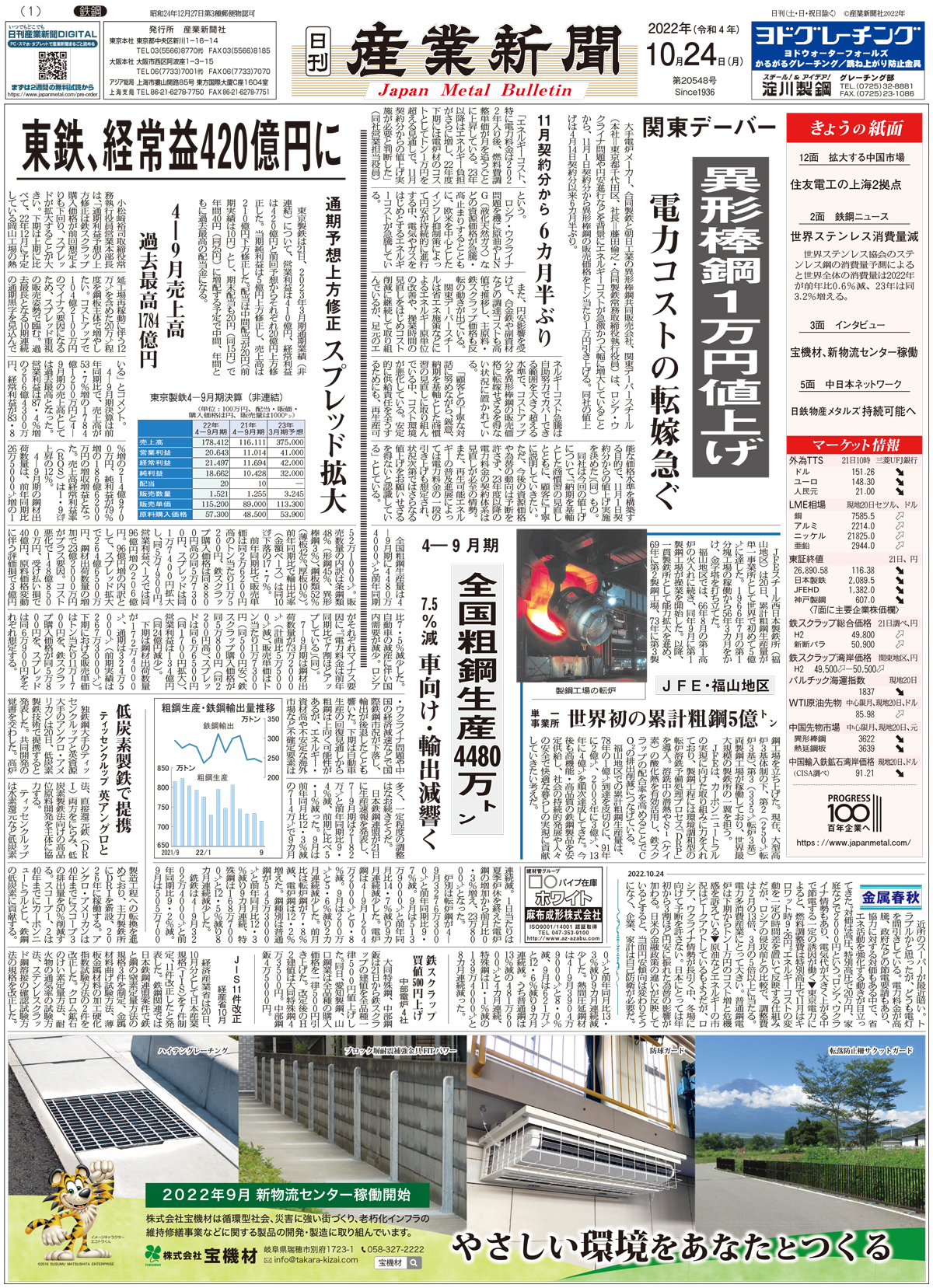 10月から月1万2000円(税別) 電子版単独は据え置き 産業新聞社は10月1日から本紙「日刊産業新聞」の購読料を月額1万1000円(消費税含まず)から1万2000円(同)に改定させていただきます。本体価格の改定は2021年10月、約45年ぶりに1000円の値上げを実施して以来、4年ぶりとなります。...more