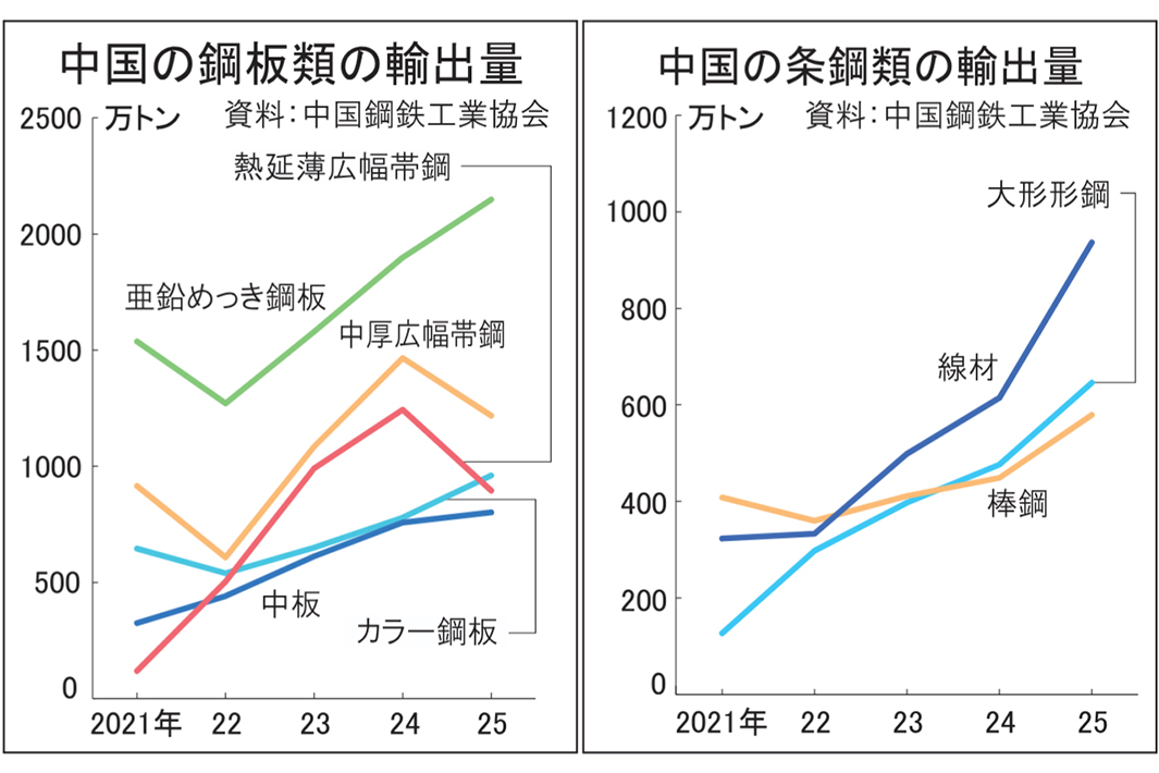 中国最大の輸出鉄鋼製品の亜鉛めっき鋼板の輸出量が2025年に2148万トンと前年比13・1%増え、過去最高を記録した。3年連続の増加。一方で従来の主要輸出品の熱延や冷延コイルは海外からの多くの通商措置で減少した。低迷する国内需要と高位の粗鋼生産量から余剰となった鋼材、とりわけ付加価値の高い鋼板類の輸出を増やし、生産と利益を確保する動きを強めた。輸出品目や輸出先の多様化が顕著となり、26年も低調な内需は変わりそうになく、より幅広い品目の中国製の鋼材が、より広い地域に向かいそうだ。