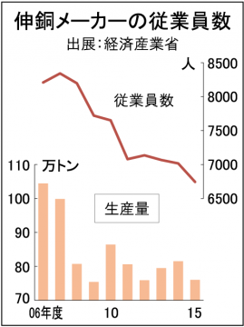 伸銅業、従業員3年連続減 16年3月、経産省労務統計