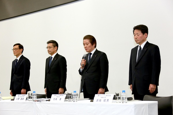 会見には三菱マテリアルの竹内章社長をはじめ、小野副社長、同社でダイヤメットを所管する加工事業カンパニーの社長を務める鶴巻二三男・常務執行役員、三菱アルミニウムの濵地昭男社長の4人が出席。竹内社長は「関係各位に迷惑をかけ、深くおわびする」などと陳謝した。