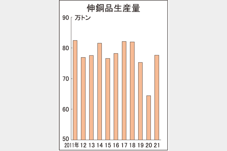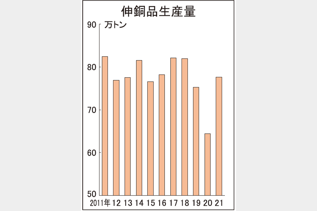 伸銅品生産 21年2割増78万トン