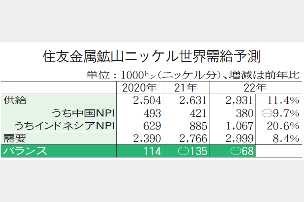 住友金属鉱山は2022年の世界のニッケル需給を6万8000トンの供給不足と予想する。最大用途のステンレス向けが堅調に推移するほか、電池向けが3割近く伸び、ニッケルの世界需要は300万トンの大台に迫るのではないかと見込む。2年連続の供給不足となるが、インドネシアでのニッケル銑鉄(NPI)生産拡大などから不足幅は21年より縮小する。