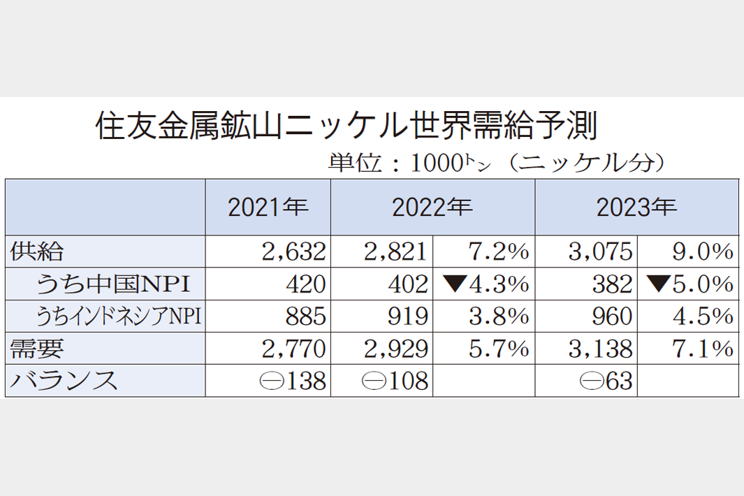 住友金属鉱山は2022年の世界のニッケル需給が10万8000トンの供給不足になりそうだとの見通しをまとめた。年度初め時点では6万8000トンの不足と予想していた。最大用途のステンレス生産が低調で需要は想定より下振れするが、それ以上に供給も減るとみている。23年はステンレス向けの復調と電池向けのさらなる伸びを見込み、需要と供給がともに300万トンの大台に乗せると予想する。