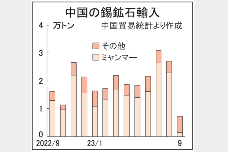 中国の錫鉱石輸入が急減した。同国の貿易統計によると、9月輸入は前月比73%減の7262トン。採掘禁止令を実施して輸出がストップしたミャンマーからが94%減の1421トンとほぼ払底した。一方で錫地金輸入は増加傾向をたどり、鉱石から地金への調達原料のシフトが鮮明になっている。