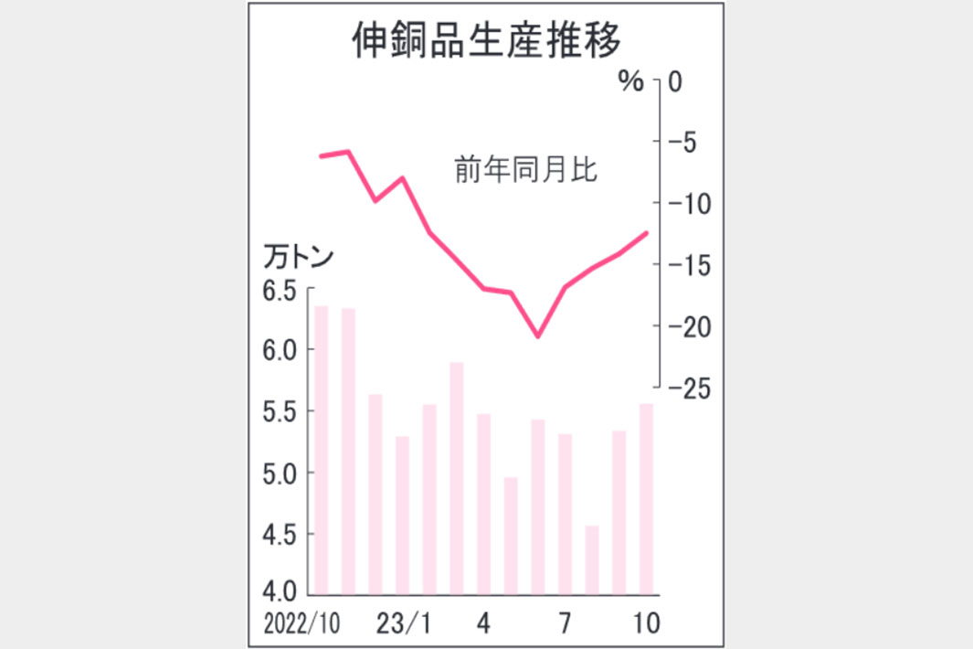 日本伸銅協会が27日に発表した10月の生産速報によると、総生産量は前年同月比12・5%減の5万5580トンだった。1年10カ月連続の減少で、10月としては1975年(5万630トン)以来の低水準を記録した。車載関連は半導体向けを含めて復調傾向が鮮明になりつつあるが、その他の分野での需要回復の遅れが重しとなった。品種別では全14品種のうち銅棒・線、黄銅板・条・管を除く9品種がマイナスだった。