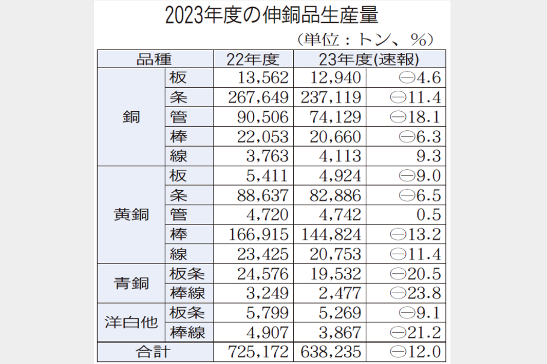 日本伸銅協会がこのほど発表した2023年度の生産速報は、総生産量が前年比12%減の63万8235トンと2年連続で前年割れとなった。上半期まで続いた車載関連の在庫調整が重しとなったほか、中国経済の停滞による半導体需要の不振などが影響。新型コロナ禍の影響を最も受けた20年度の生産量を1万8000トン以上下回った。品種別はマイナスだったのが全14品種中12品種で、このうち7品種が2桁減だった。