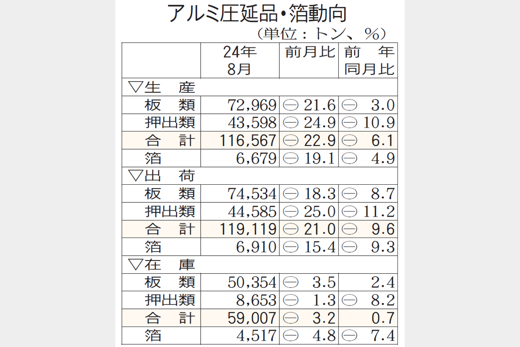 8月のアルミ圧延品(板・押出)の出荷は、台風などによる物流停滞で前年同月を1割ほど下回った。日本アルミニウム協会がまとめた8月の生産・出荷動向によると、缶材、自動車、建材の主要分野で出荷量が前年を大きく割った。一方で箔はリチウムイオン電池(LiB)向けで一部復調が見られた。協会関係者は一過性の自然災害要因から「9月の復調に期待している」と語った。