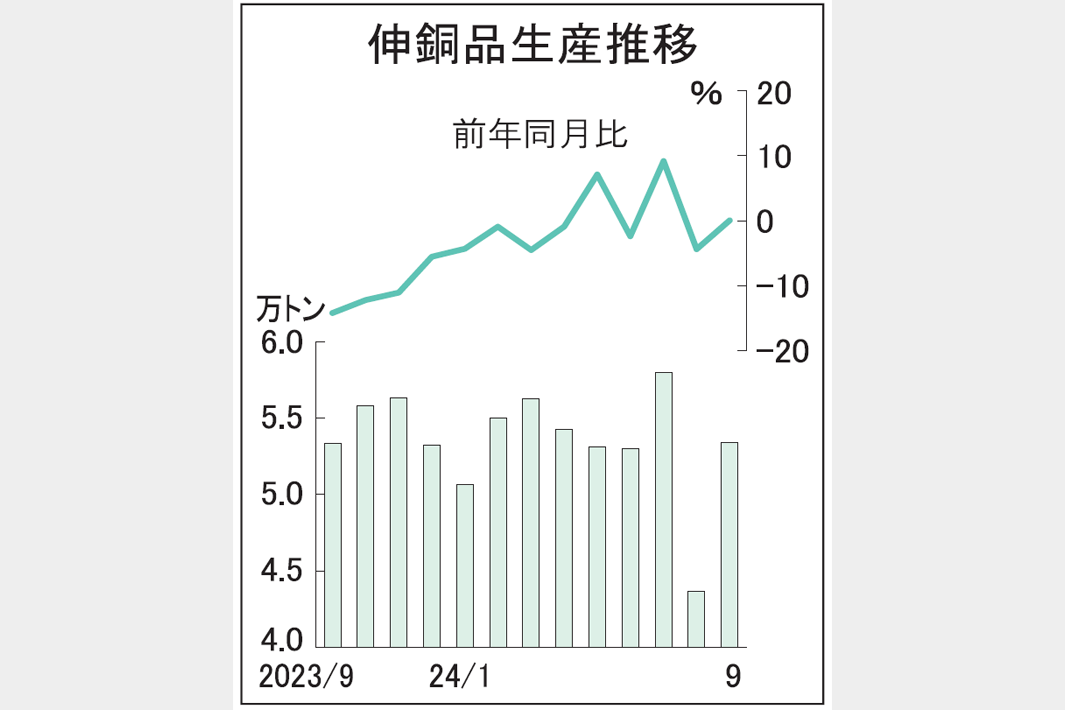 日本伸銅協会が22日発表した9月の生産速報によると、総生産量は前年同月比0・1%増の5万3400トンで、2カ月ぶりのプラスだった。世界的な自動車生産台数の回復や半導体販売の復調が需要をけん引したほか、海外での一部民生品の需要も戻り始めたことが寄与。一方、情報/生活家電や住宅設備関連は調整局面から脱し切れず低迷が続いた。品種別は全14品種のうち10品種がプラスで、このうち4品種が2桁増だった。