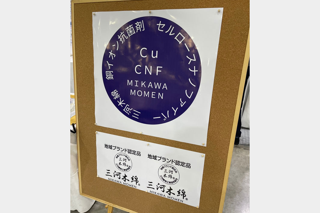 また、CNFを添加した銅抗菌剤を用いた三河木綿のブランド化を図るため、独自のマークをデザイン化。試作品にもマークを貼り付け、高品質な正規製品であることをアピールしている。