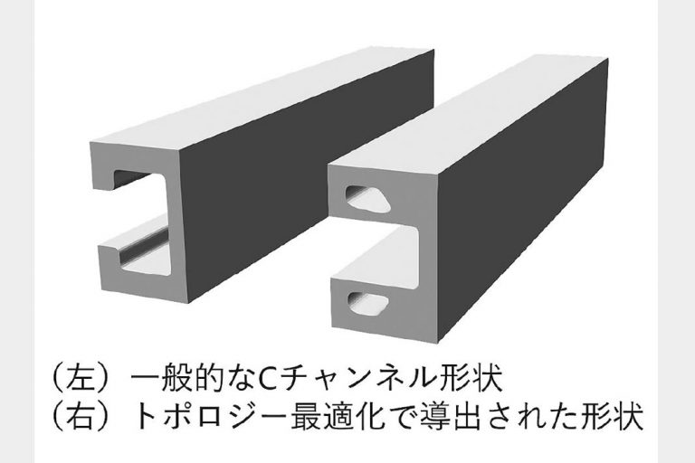 今回開発に取り組むシステムでは、トポロジー最適化技術を活用する計画。同技術を用いることで強度や剛性を維持しつつ、応力のかからない部分や構造的に重要ではない部分を削り取ることができ、より軽量な構造の形材を実現できる。
