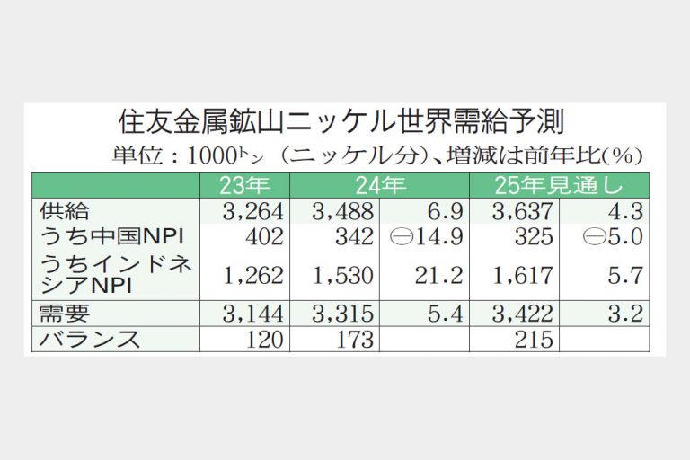 住友金属鉱山はこのほど2025年のニッケル需給見通しをまとめ、世界需給は21万5000トンの余剰になると予想した。インドネシアでの過剰生産に加え、車載用リチウムイオン電池(LiB)向け需要もほぼ伸びないとの見方から、余剰幅が24年の17万3000トンより拡大すると予測する。世界需給が不足に転じる時期は28年ごろを見込んでいたが、金属事業本部の丹羽祐輔副本部長は「もう少し先になるかもしれない」と話す。