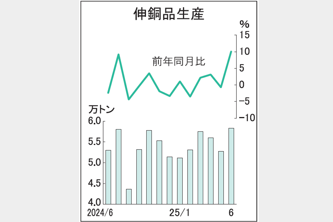 日本伸銅協会が22日発表した6月の生産速報によると、総生産量は前年同月比10%増の5万8310トンだった。前年比プラスは2カ月ぶり。14品種中12品種で増加を記録した。需要分野で見るとスマートフォンやAI・データセンター関連が堅調で、自動車関係も底堅かったが、建築・住宅設備や一般民生用途は引き続き低調な状況が続いた。