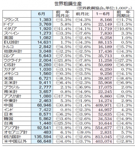 世界粗鋼 1-6月2%減8・1億トン