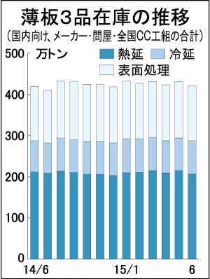 6月末の国内向け薄板3品在庫(メーカー・問屋・全国コイルセンター工業組合の合計、速報値)は前月比2・6%、11万トン減の420万2000トンになった。例年、6月末は6万トン程度減少する傾向にあるが、高炉メーカーが4月から本格的に実施した減産が一定の効果を発揮し、例年を上回る減少幅になった。