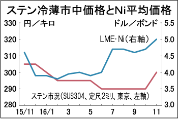 関東地区のNi系ステンレス全面高 冷薄、1年ぶり30万円台