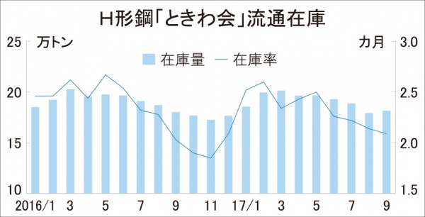 新日鉄住金によると、形鋼流通で構成する「ときわ会」のH形鋼の9月末在庫は、18万1600トンと前月比1・2%増となった。夏季炉修のあった前月からの反動で、入庫量増が影響した。在庫は4カ月ぶりに増加に転じたが、在庫率は0・05ポイントダウンの2・09カ月となり改善に向かっている。足元ではメーカーロールがフルに埋まっているほか、高水準の建築需要、土木など鋼矢板が需要期を迎えることから、需給のタイト感は一段と増していく見通し。