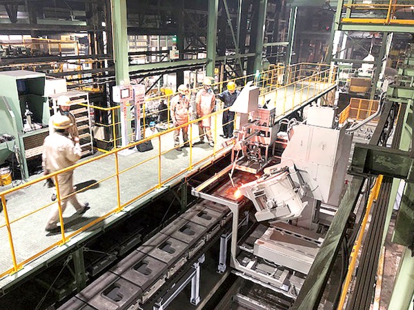 日本高周波鋼業グループの高周波鋳造(本社=青森県八戸市、大久保寿之社長)は、総額約5億円を投じて2017年8月から工事を進めていた生型鋳造ラインの更新工事が完工し、本格稼働を開始した。新ラインは、36年間稼働した鋳造ライン(小物製品対象)の老朽化に伴い、生産性向上と歩留まりのさらなるアップを目的としている。機械設備能力増強と歩留まり改善を合わせて40%の生産性向上を見込む。併せて作業の安全性向上のため自動注湯機1基を導入し、砂回収系統設備の能力増強も実施した。