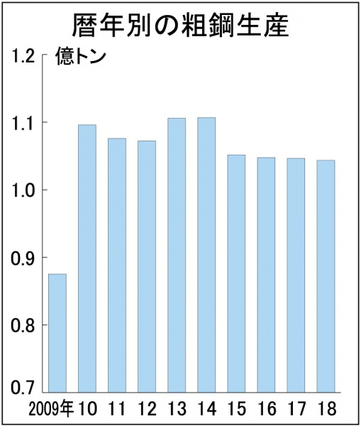18年全国粗鋼 4年連続減1億433万トン 生産トラブル、災害影響