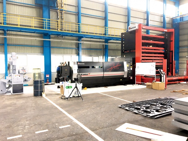 小野建は8月下旬、滋賀営業所・倉庫(滋賀県蒲生郡竜王町)にアマダ製の最新鋭のファイバーレーザー切断機「ENSIS―3015AJ」(出力=3kW)を1基と付帯設備として10段のパレットチェンジャー1基、さらに小板用のショットブラスト設備1基を導入した。導入後、レーザー切断機のテスト加工を行い、9月から稼働を開始。同社のレーザー加工拠点としては堺スチールセンター(大阪府堺市西区)、姫路営業所(兵庫県姫路市飾磨区)に次ぐ3カ所目となる。地区ユーザーがH形鋼とセットで、ガセットプレートなど鋼板から加工した部材を要求するケースが増えており、これに対応するのが狙い。建築向け以外に、地区の製缶、板金向けでもレーザー加工対応を行う。