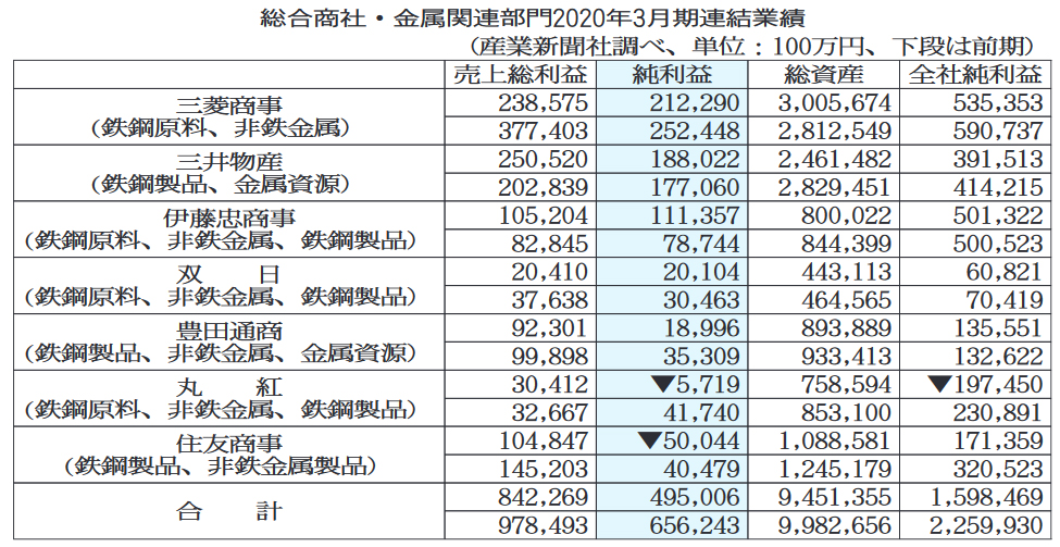 総合商社7社の2020年3月期連結決算が8日出そろったが、金属関連事業の純損益は三井物産、伊藤忠商事の2社が増益で、三菱商事、双日、豊田通商の3社が減益、住友商事、丸紅の2社が赤字となった。鉄鉱石価格が上昇する一方で石炭や銅の価格が下落し、エネルギー向け鋼管ビジネスも低迷する中、得意分野の違いで明暗が分かれた。今期については、新型コロナウイルスによって地球規模で経済活動が停滞しており、多くが鉄鋼・非鉄分野の需要減少と価格低迷を想定している。