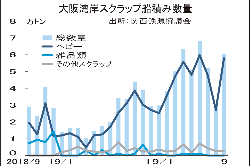 大阪地区の鉄スクラップ関連企業で構成する関西鉄源協議会(代表幹事=黒川友二・扶和メタル会長)がまとめた9月の大阪湾岸スクラップ船積み数量は、総計で前年同月比79%増の6万347トンだった。3カ月ぶりに6万トンを超えた。内需減などに伴ってヘビースクラップの輸出が大幅に増えている。