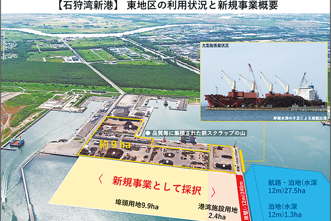 国内で初めて3万トン超の鉄スクラップ大型船が満載出港できる公共岸壁の整備が、北海道石狩市と小樽市にまたがる石狩湾新港東地区で決まった。総事業費は92億円。工事期間は2021―26年度までの6年間で、25年度はじめの暫定供用開始を目指す。石狩湾新港管理組合(以下、管理組合)や日本鉄リサイクル工業会(以下、工業会)が働きかけてきたもので、国際競争力の強化が急がれる輸出体制のモデルケースになりそうだ。