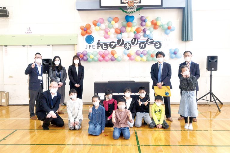 JFE条鋼豊平製造所(札幌市、所長・小山内寿取締役常務執行役員)は3月30日、社会貢献活動の一環として、札幌市西区の平和児童会館に電子ピアノを寄贈した。児童会館で催された贈呈式では、参加者の距離を保ち、代表児童による演奏(女児1人、男児1人)、特筆機能の紹介、ピアノとペープサート人形劇のコラボレーションが披露された。事前の練習の成果もあり、盛大なセレモニーとなった。豊平製造所では、児童会館を運営している公益財団法人さっぽろ青少年女性活動協会に2018年度から物品を寄贈している。