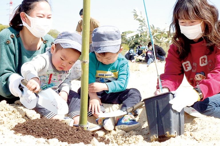 参加した子供たちは懸命に作業し、最後は苗木の横に植樹した人の名前を記したプレートを打ち込み、水やりをして完了。降り注ぐ日差しの中、「難しかったけど楽しかった」「早く大きくなってほしい」と子供たちの明るい声が響き渡った。
