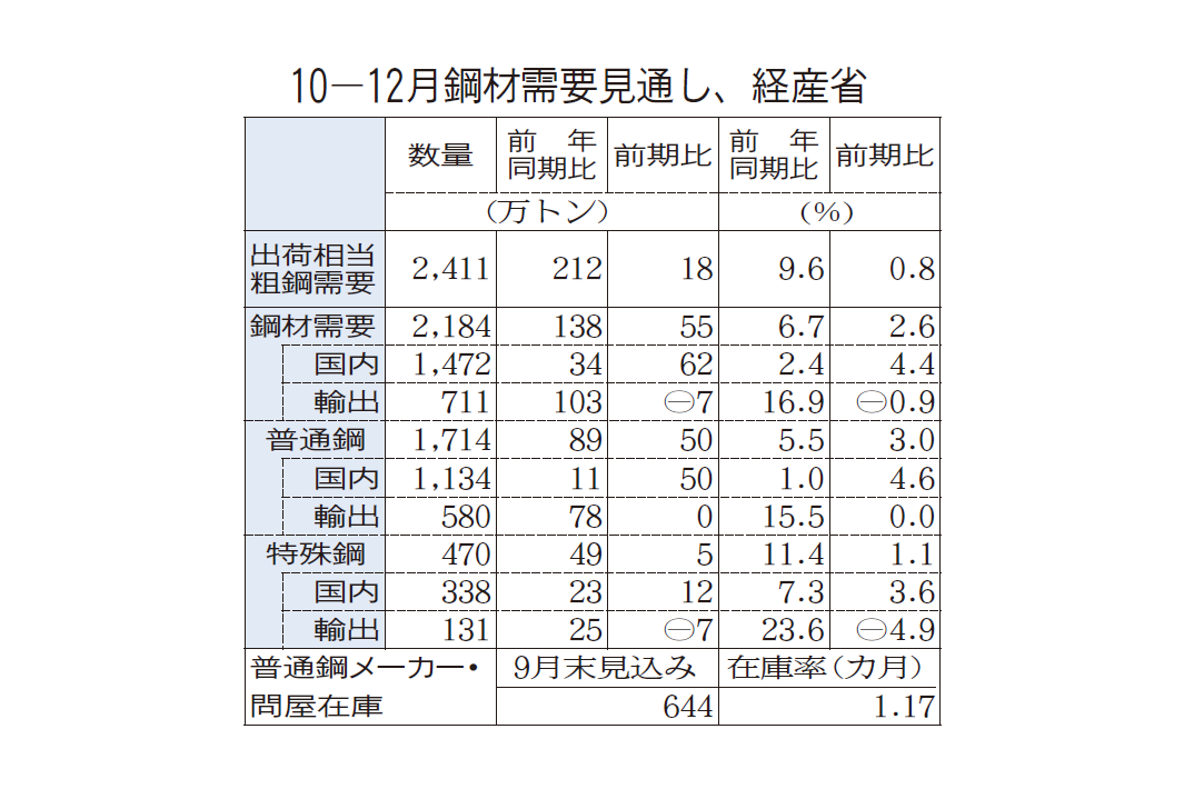 10―12月見通し 粗鋼需要2411万トンに増 一部品薄残る