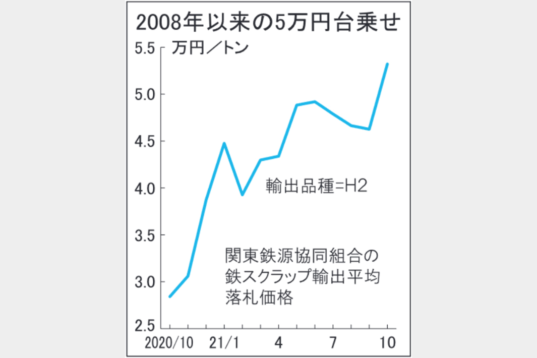 関東鉄源協同組合(理事長=山下雄平・ヤマシタ社長)が12日に実施した10月契約分の鉄スクラップ輸出入札は、平均落札価格がトン当たり5万3213円(H2、FAS=船側渡し)となり、2008年8月以来、13年2カ月ぶりに5万円を超えた。前月比6963円値上がりで、4カ月ぶりに反発した。強基調で推移している海外相場が落札価格に反映された格好。独歩高だった日本の相場に海外相場が追いついてきている。