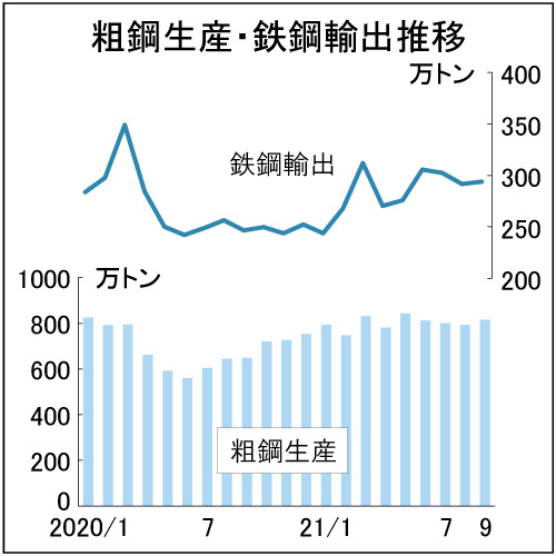 全国粗鋼、4―9月3割増4842万トン 需要回復、高炉フル操業
