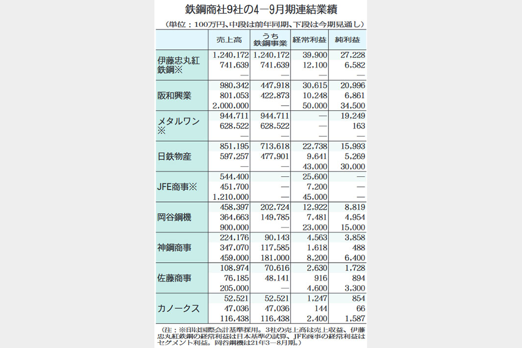 鉄鋼商社9社 4―9月期 需要が回復 3社通期最高予想