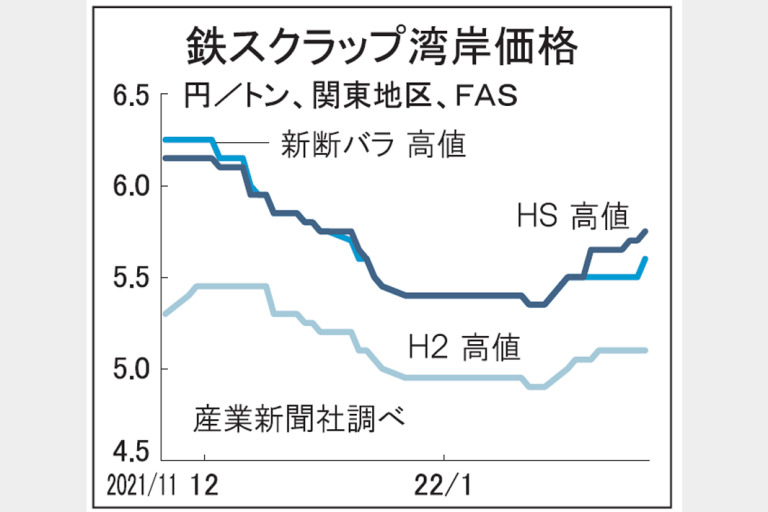 鉄スクラップ上級品種の一つであるHSの価格が関東地区で上昇している。関東地区の湾岸価格(シッパーの集荷価格)は27日時点でトン当たり5万6000―5万7500円前後で推移しており、直近安値(14日時点)より約4000円高くなった。1月中旬以降、韓国からの引き合いが特に強まったため。市中発生の低迷も需給が締まった一因とみられる。
