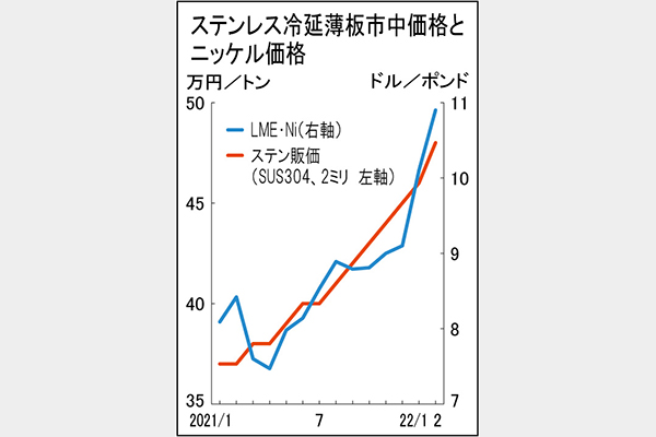 ステンレス冷薄市況 ニッケル系、月内続伸へ 上昇急ピッチ、今夏60万円到達も