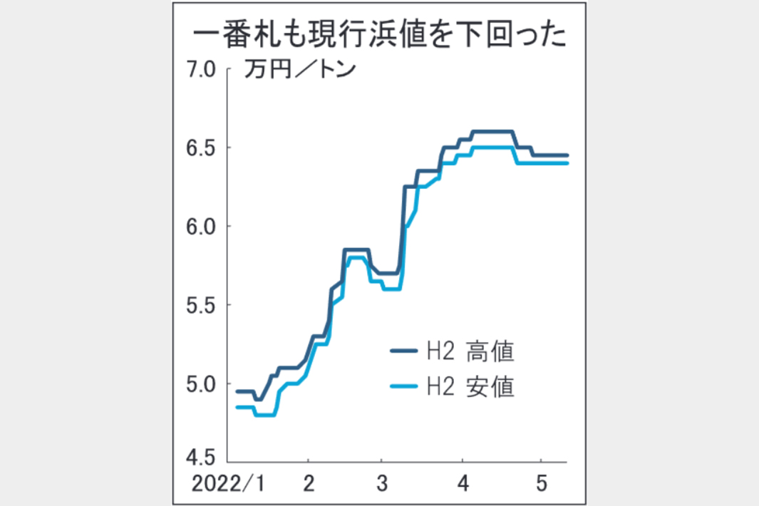関東鉄源協同組合(理事長=山下雄平・ヤマシタ会長)が11日に実施した5月契約分の鉄スクラップ輸出入札は不調だった。応札価格が組合の希望価格に達せず、昨年12月以来5カ月ぶりに成約に至らなかった。国際価格の下落とアジア向け輸出商談の低迷を映した。1番札は11日時点の関東湾岸価格トン当たり6万3500―6万4500円前後を大幅に下回ったようだ。4月末から調整局面入りしている国内相場の下押し圧力がさらにかかるとみられる。