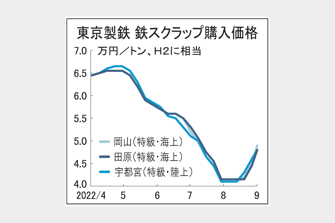 国内の鉄スクラップ相場が半月でトン当たり7000円前後上昇した。国際相場の上昇を受けて国内電炉メーカー各社が盆明けから対応値上げを実施し続けている。日本鉄スクラップ総合価格(東名阪3地区の電炉メーカー購入価格平均、産業新聞調べ、1日時点)は、指標品のH2が4万7700円に上昇。前日から1100円(1・9%)、直近安値の8月17日からは6800円(16・6%)、それぞれ高くなった。ただし8月末ころから輸出商談が減り、複数筋が「相場の上伸力は弱っている」と指摘する。9月中に国内電炉の買値が5万円に到達するか否かにマーケットの注目が集まっている。