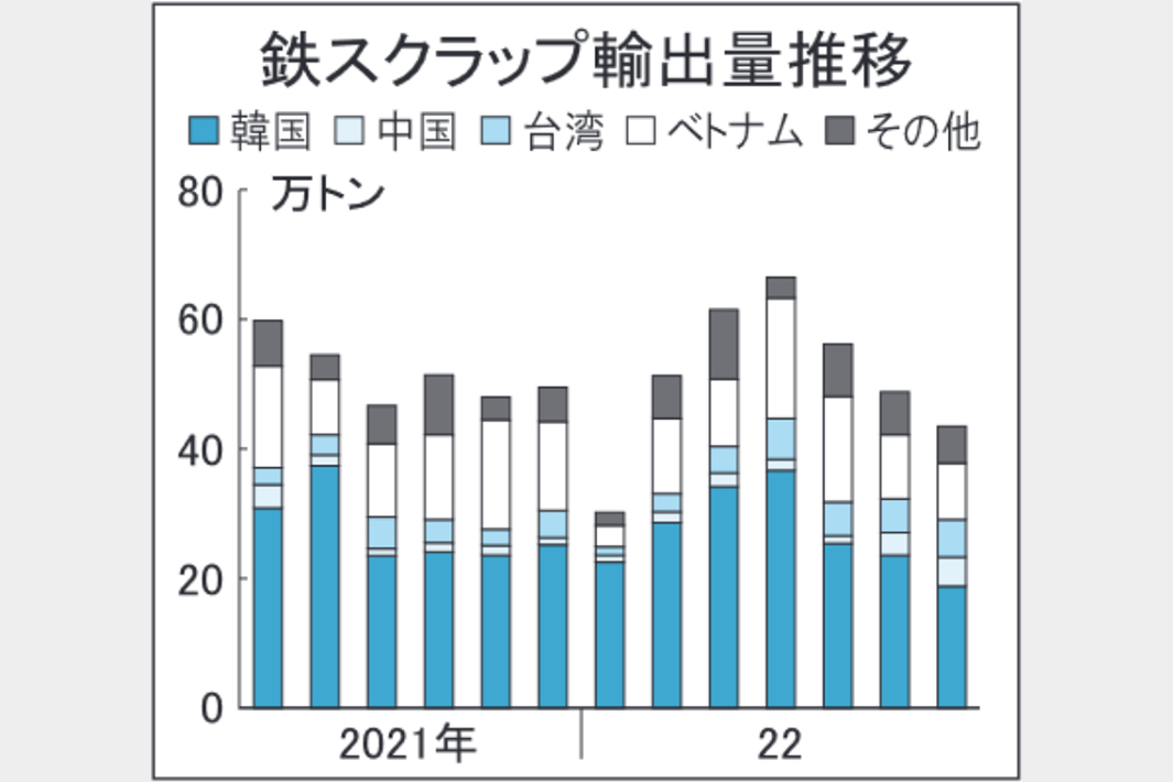 7月の鉄スクラップ輸出量は43万5000トンだった。前月から10・9%、前年同月比では27・3%それぞれ少ない。日本からの輸出全体の約6割を占める韓国向けとベトナム向けの輸出量が前年同月から約4割減ったことが影響した。ロシアの割安なビレットがアジアに流入したことなどが両国の鉄スクラップ需要を低迷させた。日本からの輸出総量は3カ月連続で前月から減り、14カ月連続で前年同月から減っており、昨年来の輸出の衰えを映した。