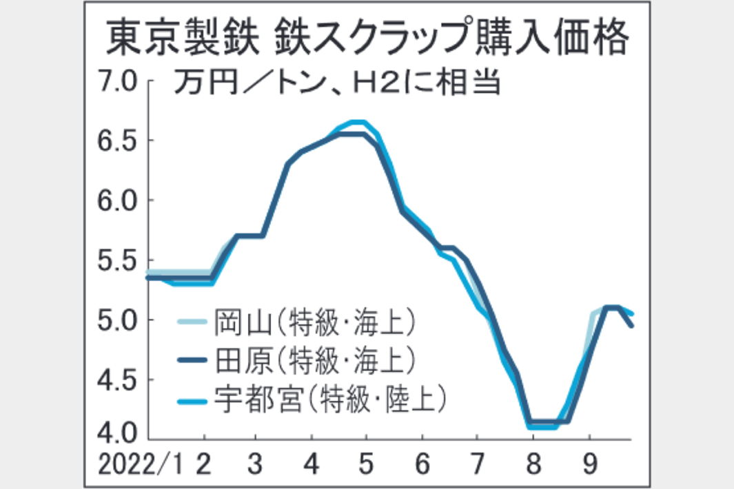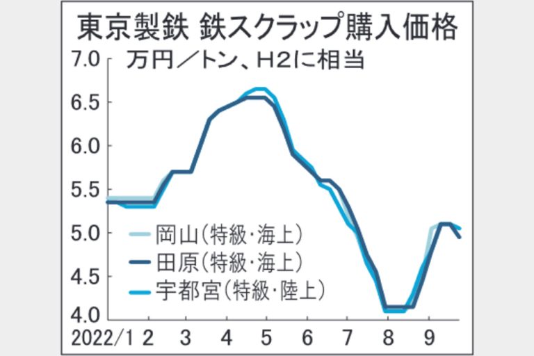 国内の鉄スクラップ市況が先週末の23日に2カ月ぶりに反落した。海外市況の軟化を映した。日本の主要輸出相手の韓国やベトナム向けの商談も価格・量ともに低迷している。電炉大手の東京製鉄は23日入荷分から全拠点の特級(H2相当品種)の購入価格をトン当たり500円下げ、週明けの26日にかけて全国に値下げの動きが広がった。日本鉄スクラップ総合価格(H2、26日時点、産業新聞調べ)は直近高値の16日から600円下がり、5万円になった。中部地区の市況は17日に他地区に先行して下落していた。