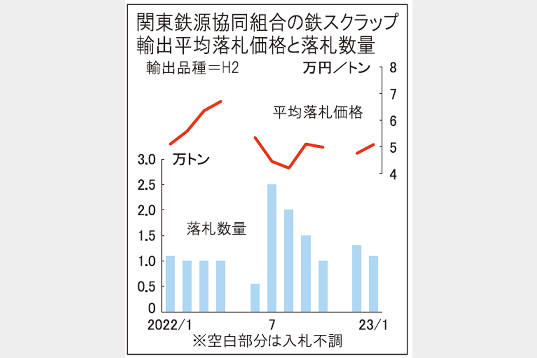 関東地区の鉄スクラップ加工業者らで作る関東鉄源協同組合(理事長=南光司・ミナミ社長)は、12日に実施した1月契約分(2月積み)の鉄スクラップ輸出入札で、地区相場をトン当たり1000―1500円上回る5万932円(H2、FAS=船側渡し)の平均落札価格を付けた。5万円台に乗せたのは昨年11月ぶり。冬季の鉄スクラップ供給難によって海外の鉄スクラップ需給が締まり、日本玉へのアジアからの引き合いが強まって今回の高値につながったようだ。国内の相場全体を高値圏に引っ張り上げる可能性が大きい。