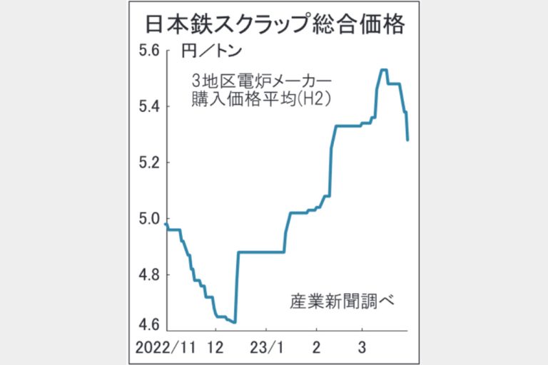 国内の鉄スクラップ市況が2週連続で下がっている。日本鉄スクラップ総合価格(3地区電炉メーカーの鉄スクラップ購入価格平均、H2、産業新聞調べ)は29日にトン当たり5万2800円となり、前日から1000円、直近高値の16日から2500円それぞれ下がった。鉄鋼需要減退による海外の鉄スクラップ相場の下落や、為替の円高が国内市況を冷やした。輸出の不振が目先で解消される見込みは立っておらず、価格下落は今後も続く可能性が高い。