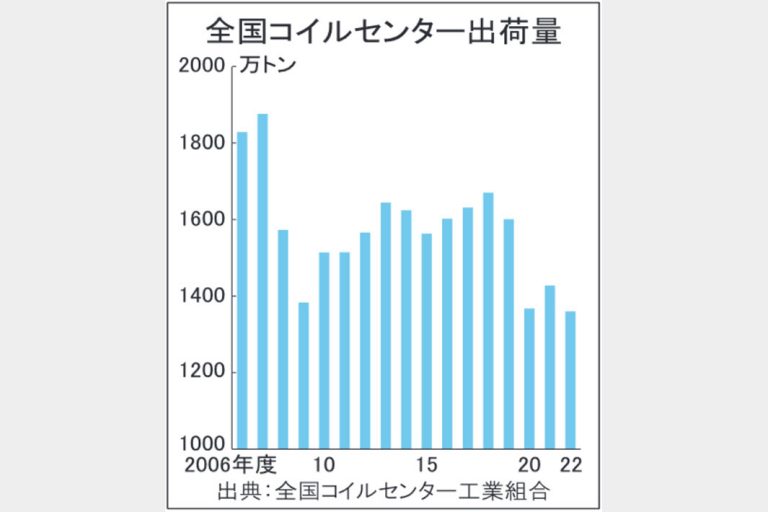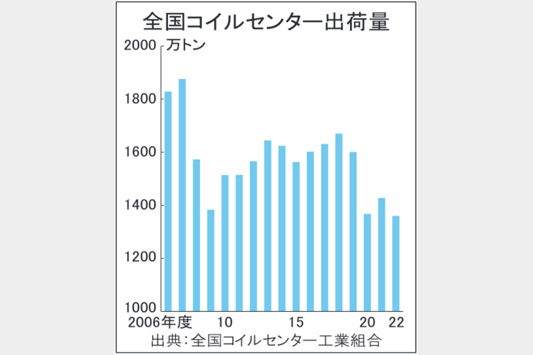 全国コイルセンター工業組合(理事長=小河通治・小河商店社長)がまとめた流通調査結果によると、2022年度のコイルセンター出荷量は前年度比4・7%減の1359万8378トンと2年ぶりに減少し、過去最低となった。主力向け先の自動車と建築がともに低迷。自動車は部品不足が解消されず、建築は住宅や工場、倉庫の着工が伸び悩んだ。直近3年間の出荷量は20年度が過去2番目、21年度が過去4番目の低さと、1400万トン前後が定着しつつあり、今後も新型コロナウイルス禍以前の1600万トンレベルに戻らない可能性がある。