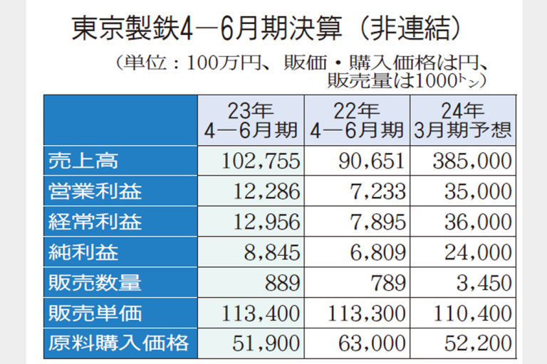 東京製鉄は21日、2024年3月期の単独業績予想について、前回予想時から営業利益を50億円増の350億円(前年同期比8・0%減)、経常利益を50億円増の360億円(同8・3%減)、純利益を30億円増の240億円(同22・2%減)にそれぞれ上方修正した。4―6月期は販売単価が想定を上回り、出荷数量も増加。鉄スクラップ購入価格の下落や稼働率向上も寄与した。売上高は四半期としては過去最高となった。