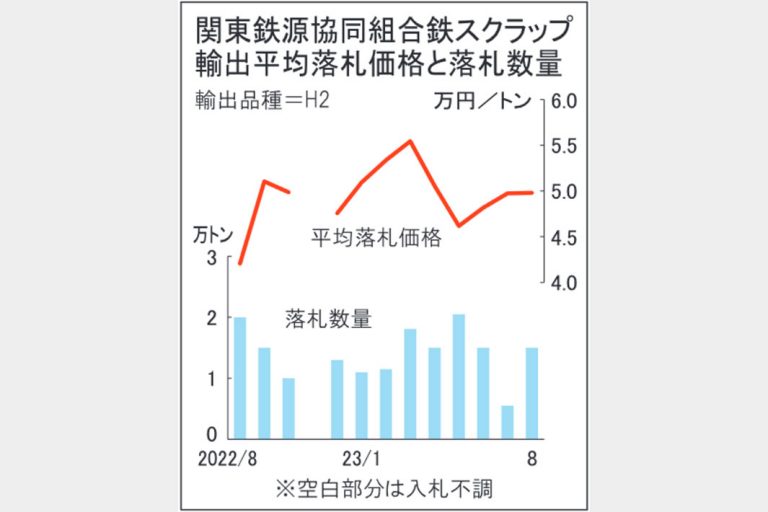 関東地区の鉄スクラップ加工業者で構成する関東鉄源協同組合(理事長=南光司・ミナミ社長)が9日に実施した8月契約分(9月積み)の鉄スクラップ輸出入札の落札価格は、トン当たり4万9799円(H2、FAS=船側渡し)だった。7月実施の前回比で59円高く、3カ月連続で上昇した。バングラデシュの堅調な鉄スクラップ需要と為替のドル高円安とが影響し、前回と同水準の価格を維持した。落札価格は足元の関東相場と同程度で、目先の国内市況を左右する公算は小さい。