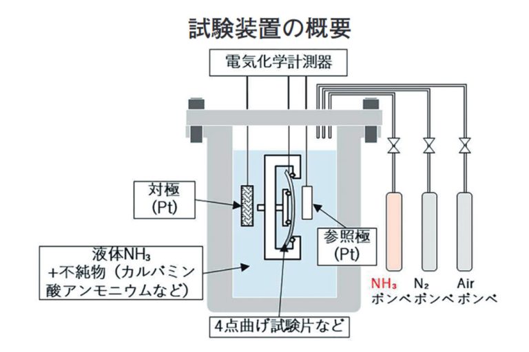 JFEスチールは16日、液体アンモニア中の鋼材の応力腐食割れ発生のリスク評価を可能とする試験設備をスチール研究所(倉敷地区)に導入、10月末から稼働を開始したと発表した。脱炭素社会へ向け、日本のグリーン成長戦略で火力発電燃料や船舶燃料として利用が期待されるアンモニアは、そのサプライチェーンでのアンモニア貯蔵タンクの大型化を加味、大型化に必要な高強度鋼の開発が求められている。貯蔵・船舶輸送の際の液化アンモニアの応力腐食割れ(SCC)を勘案、発生リスクを適切に評価、高圧ガス保安法に則った建屋と試験設備を建設。材料の耐SCC性を評価できる試験片を浸漬、電気化学測定を実施可能とした。